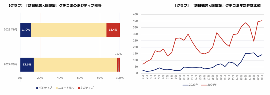 それに対し2024年はポジティブ投稿が大きく伸びており、訪日観光において「処理水」を始めとする国家間の感情問題は払しょくされているものと考えていいだろう(9月18日の事件は報道管制の結果、訪日観光には影響を与えていない)。