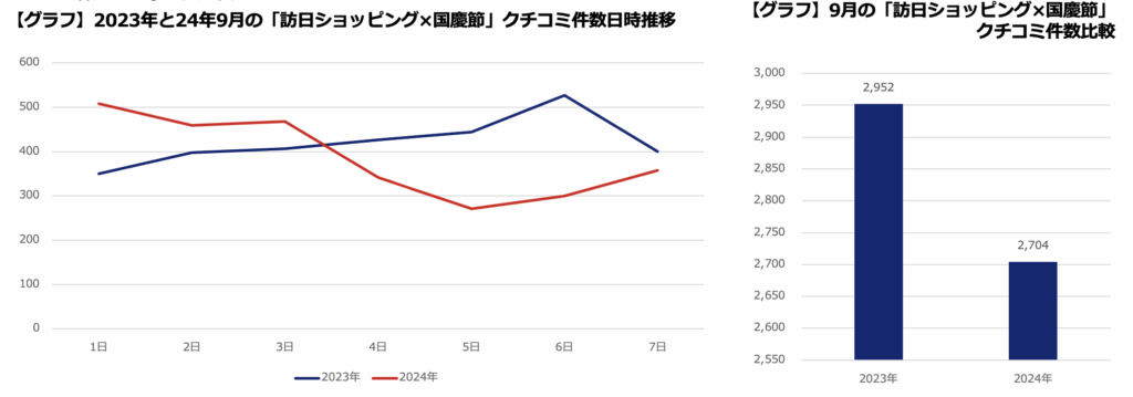 日次で見ると、2023年には「国慶節に日本にいくなど信じられない」といった投稿があったが、2024年にはそうしたものも消え、純粋に観光やショッピングガイド投稿が増えており、下旬にはそれを盛り上げる傾向が見られた。