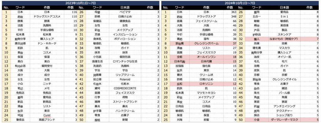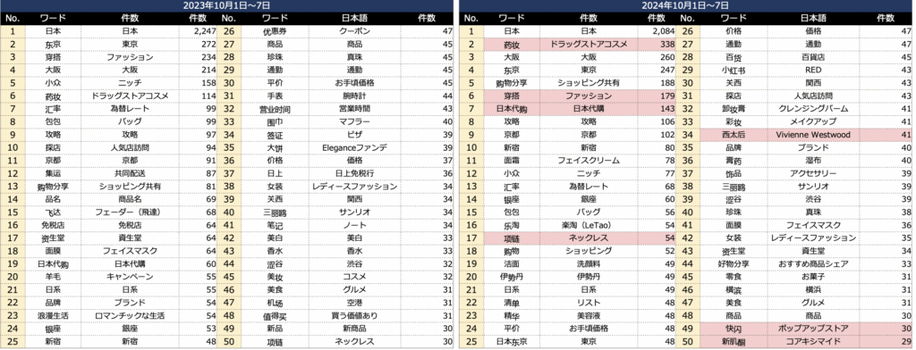 また2023年には見えなかった「日本代購」のワードも上がっている。訪日時の情報源として利用しているほか、代購の進めた商品や「欲しいものは代購で済ませ、観光に集中」という動きもありそうだ。