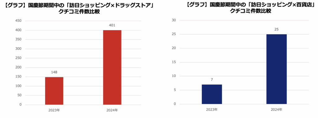 訪日ショッピングの2大チャネルである「ドラッグストア」と「百貨店」、国慶節中のそれぞれのクチコミを収集、簡易分析を試みた。いずれも通常の「中国訪日観光クチコミレポート」と同様、「国慶節」を含まないワードでの検索である。